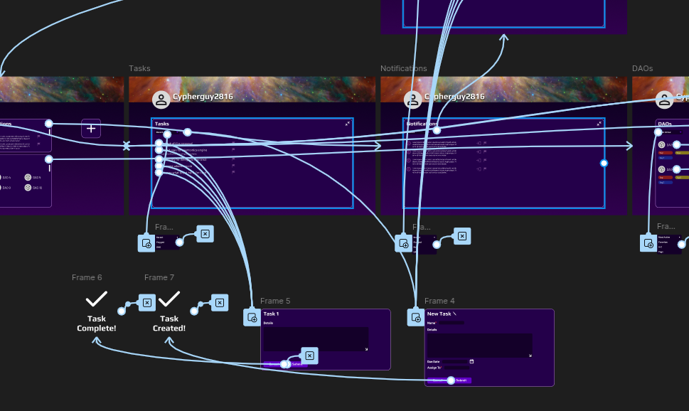 In light of this, I pivoted my product from a communications platform to a productivity dashboard. I designed tools for displaying and checking notifications, completing tasks, and organizing the DAOs that contributors were a part of. I also included in my design a widget that would allow users to plug custom built tools, introducing composability to accommodate the diverse needs of different organizations. However for this study, I did not expound on this feature and instead focused on essential functions required for effective DAO contribution.